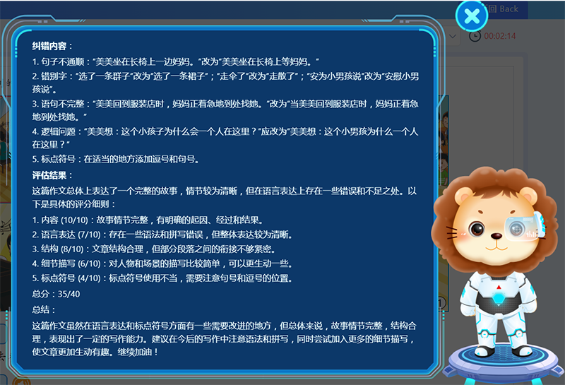 Equipped with an AI-powered writing evaluation feature, it assesses students' online submissions, detects errors, and provides a composition grade assessment. This helps spark students' interest in writing, enhances their learning experience and outcomes, and supports them in improving both their writing skills and composition grades. At the same time, it meets the needs of schools for technology-integrated teaching, improves teachers' efficiency, and reduces the workload.